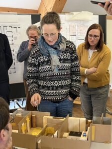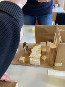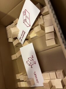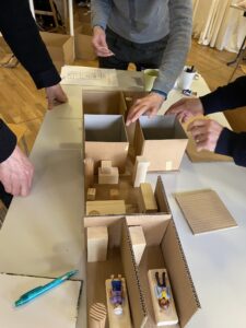 Dreißig Genossenschaftsmitglieder entwickelten vier Stunden lang konkrete Ideen für ihre zukünftigen Wohnungen. Anhand von einigen typischen Wohnsituationen, z.B. WG, Single, Familie, Paar entstanden dreidimensionale Musterwohnungen. Der Anschaulichkeit halber hat die AG Bau viele Holzklötzchen gesägt und gefeilt, um Einrichtungsgegenstände zur Möblierung des Wohntraums bereit zu stellen. Die neu überdachte Rasterung bildete ein flexibles Gerüst für die kreative Arbeit. Der Nachhaltigkeitsgedanke des null bis hundert Projekts spiegelt sich hier in kleinen Grundrissen wider (die Gemeinschaftsräume nicht vergessen!) und wird sich bestimmt auch in geringeren Baukosten niederschlagen.